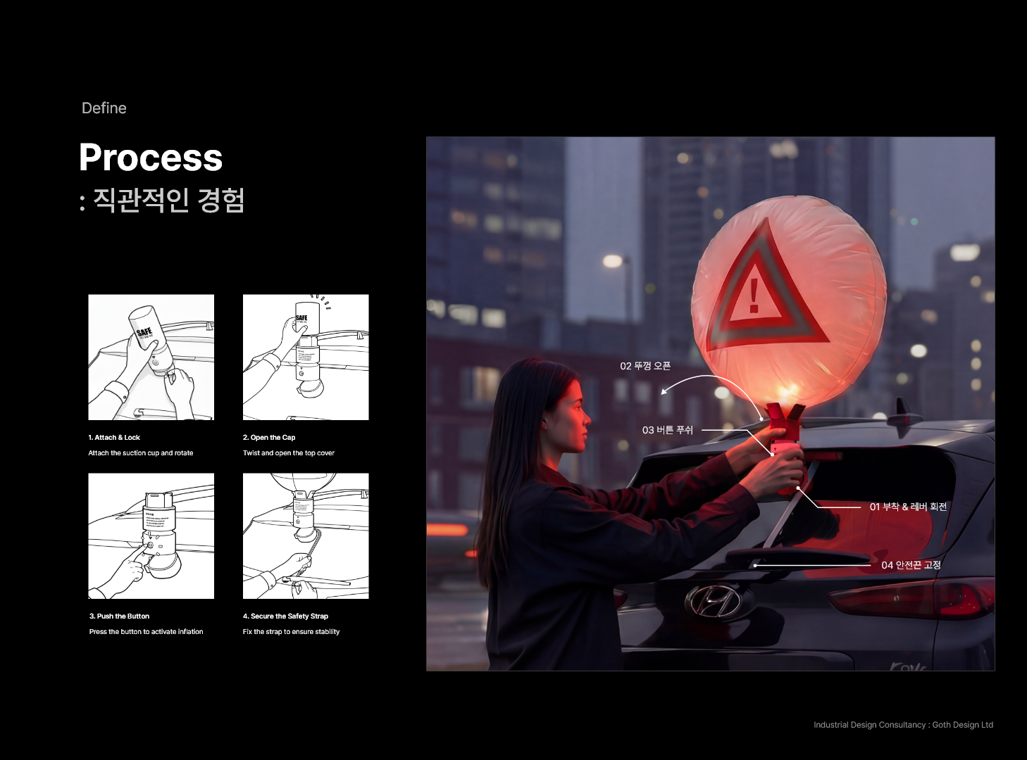 풍선 부착형 안전표시장치는 단 하나의 질문에서 시작되었습니다. 어떻게 하면 운전자를 도로 위 2차 사고로부터 지킬 수 있을까? 버려진 에어백을 새로운 안전 장치로 다시 설계하여, 지속가능성과 도로 안전, 그리고 높은 시안성을 연결했습니다.