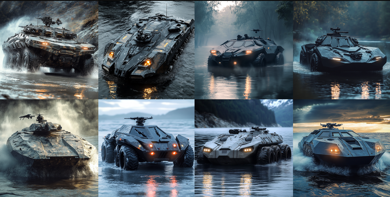 미래의 지속적인 성장과 글로벌 시장 확산을 위하여, 당사는 전장 환경에 대응하는 방위 산업의 새로운 방향성을 제시 하기 위한 생성형 AI를 적용한 방산 장비를 제안 합니다. 엔지니어링 디자인 프로세스와 제품 디자인 역량을 바탕으로, 차세대 장갑차 및 무인 방어 플랫폼에 자사의 디자인 DNA를 적용하여 선행 디자인을 수행 하였습니다.