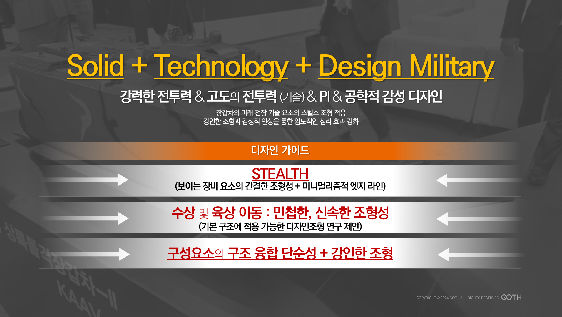 앞으로 고스디자인은 국방 연구 기관 및 산업 파트너와의 지속적인 협력을 통해 초기 단계의 개념 개발에서 생산 지향적인 국방 설계로 포트폴리오를 확장하고 , 글로벌 방위 산업에서 신뢰할 수 있는 창의적 파트너로 자리매김하고자 합니다. 또한,한국의 미래 지향적이면서도 군사적 목적에 충실한 차세대 방위 시스템의 시각적, 기능적 정체성을 형성하는데 있어서도 기여하고자 합니다.