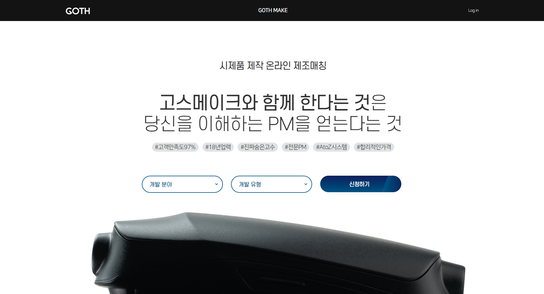 2003년부터 고스디자인과 함께 600여 디자인 프로젝트 진행한 검증된 개발 및 생산기업들을 매칭해드립니다. 수많은 개발 및 생산 기업들과 작업을 하면서 고스디자인과 가장 의사소통이 잘되고 우호적인 기업만을 선별하여 매칭하는 고스메이크(www.gothmake.com)입니다.